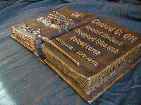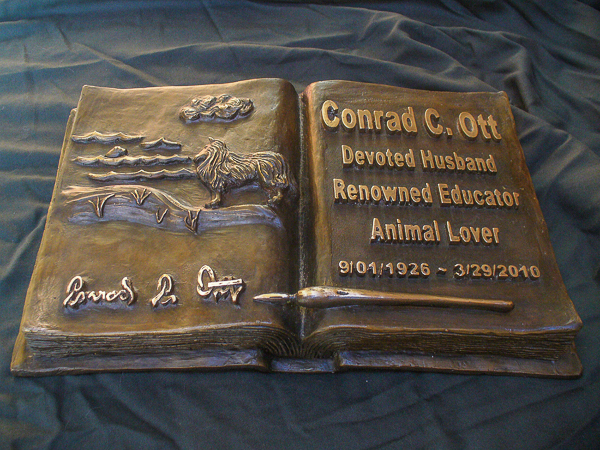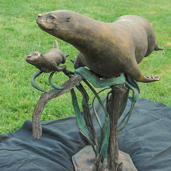The Otters is Elizabeth's first large work in bronze. The father looks on as mother teaches baby to swim. This life size bronze sculpture consists of two pieces and is publicly exhibited at The Akron Zoo in Akron, Ohio. Also created was the bronze plaque.