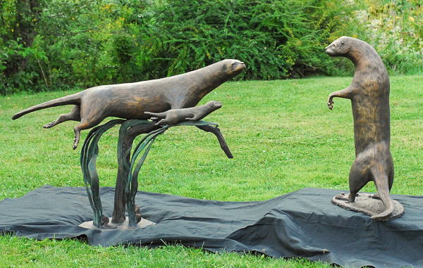 The Otters is Elizabeth's first large work in bronze. The father looks on as mother teaches baby to swim. This life size bronze sculpture consists of two pieces and is publicly exhibited at The Akron Zoo in Akron, Ohio. Also created was the bronze plaque.